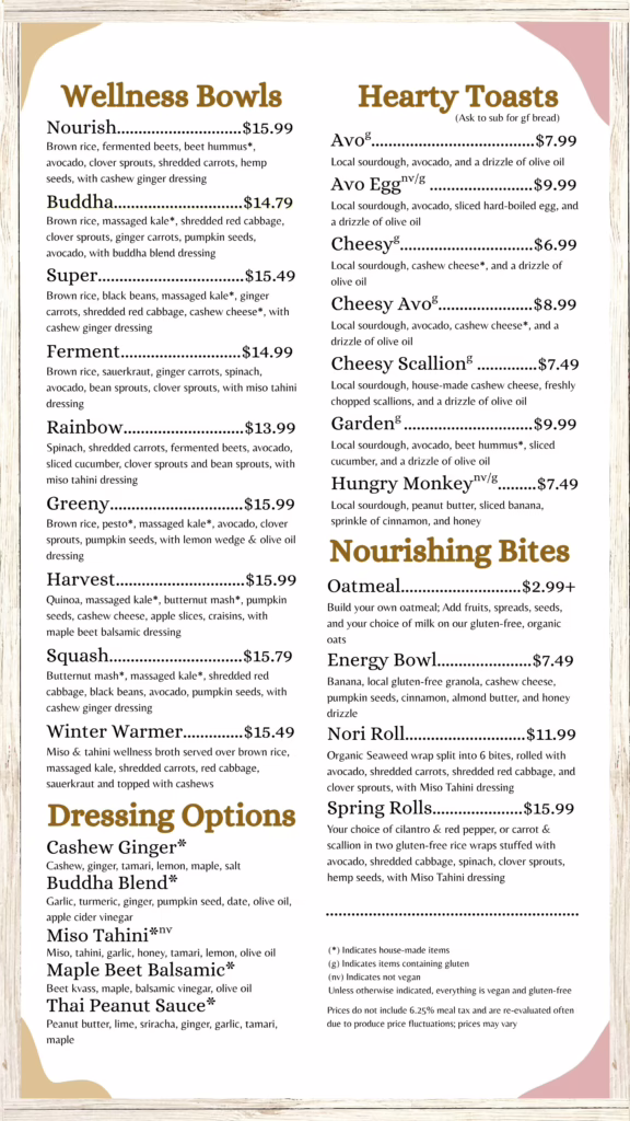 Our café is a cozy haven for 100% organic, vegan, vegetarian, and gluten-free goodness—always made with love, intention, and the freshest ingredients. Whether you’re here for a vibrant smoothie, a soul-warming bowl, or just a moment of peace, you’ll always find kindness and intention in everything we do.